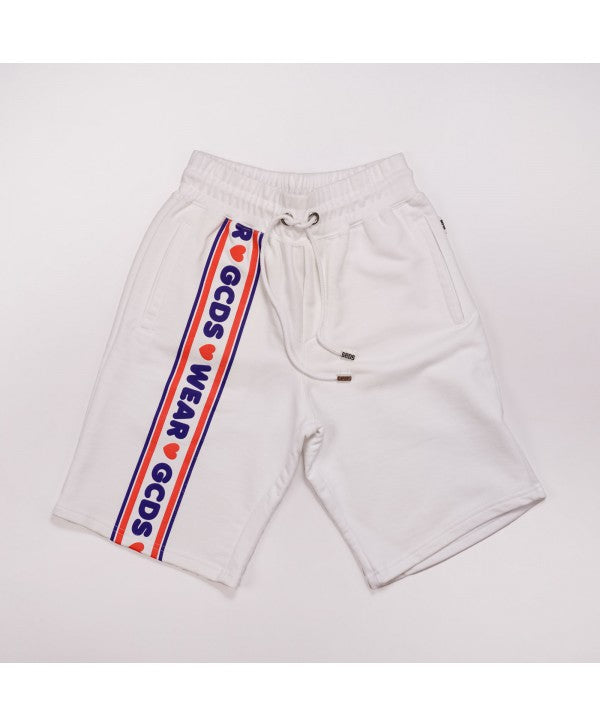 BERMUDA IN COTONE GCDS, DI COLORE BIANCO , CON MAXY BANDA CON LOGO. ELASTICO IN VITA CON LACCETTI E VESTIBILITA' ABBONDANTE . DETTAGLIO LOGO IN ACCIAIO SUL LATO DEL PANTALONCINO. COTONE ASSOLUTAMENTE RECICLABILE.