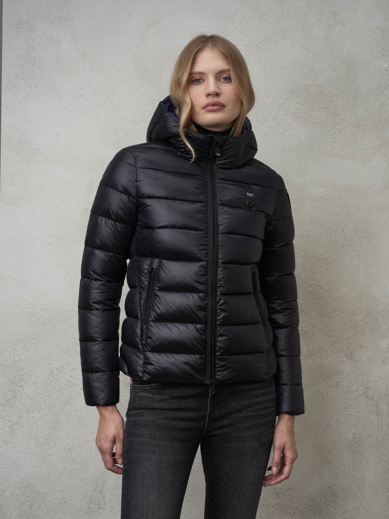 Piumino in nylon micro-rip con leggero motivo check e cappuccio fisso.