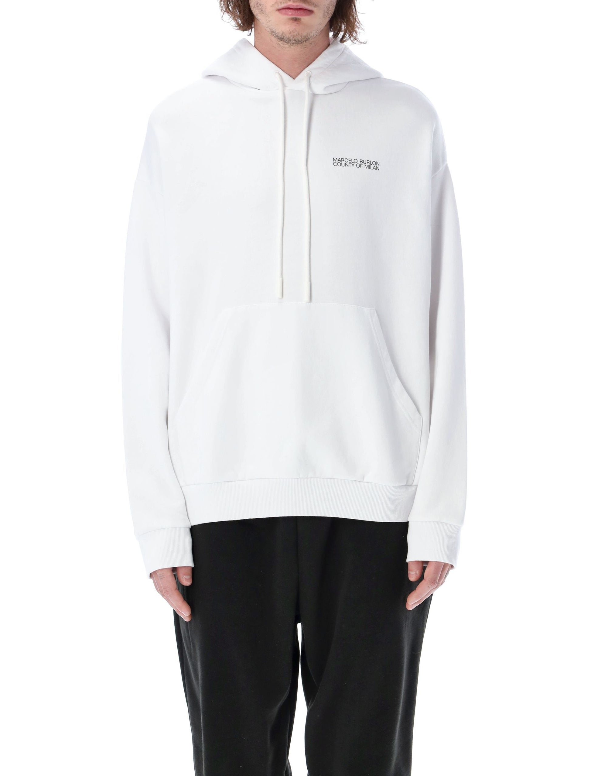 Dettagli: Cotton Tempera Cross Over hoodie by Marcelo Burlon County Of Milan. Featuring: Drawstring hood Logo printed at chest Long sleeves Dropped shoulders Kangaroo pocket Black Tempera Cross printed at back Rib trims Relaxed fit The model is 1