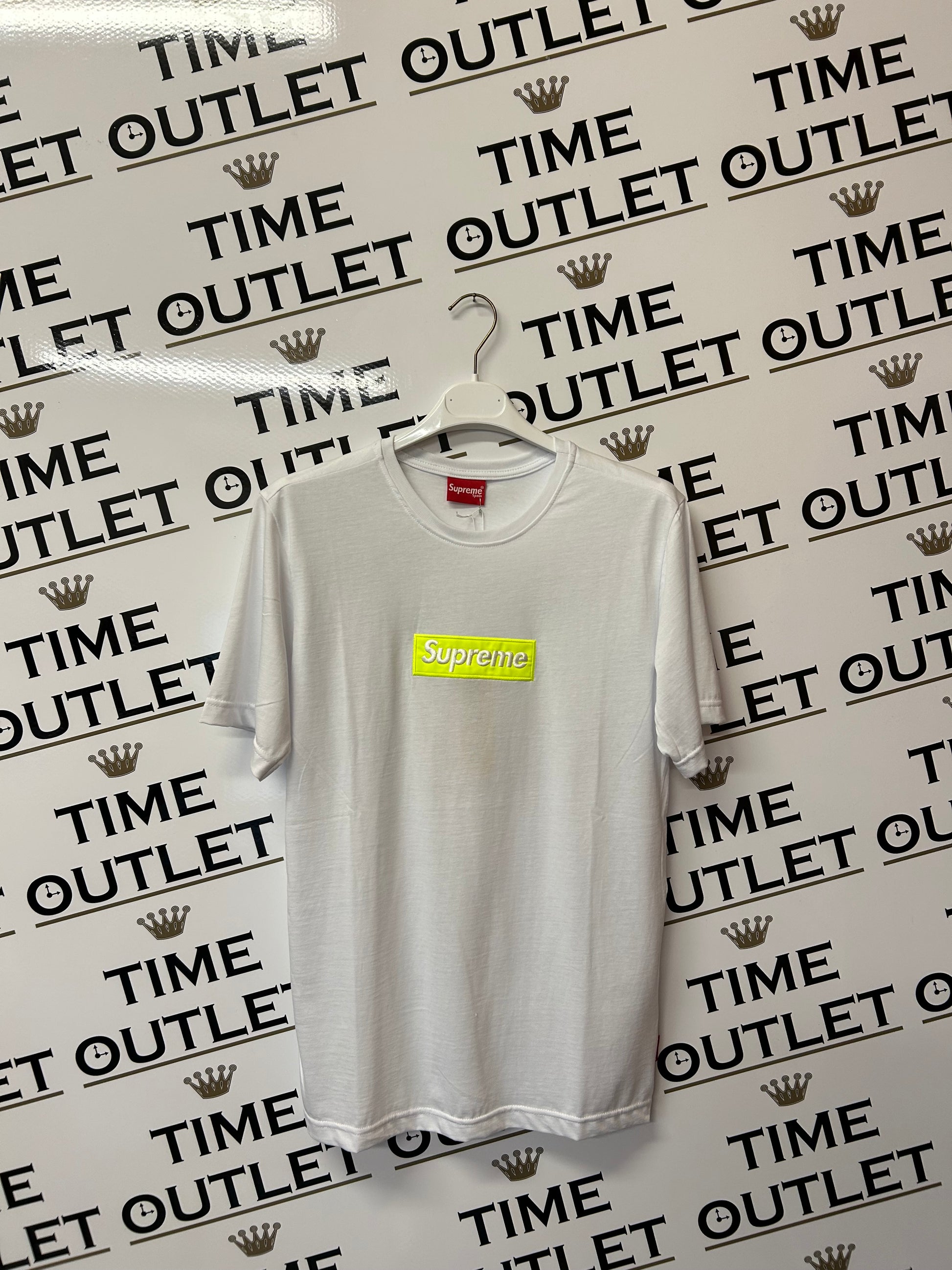 Box Logo , la t shirt é di colore bianca con il Box Logo del brand newyorkese Supreme in colore verde lime.